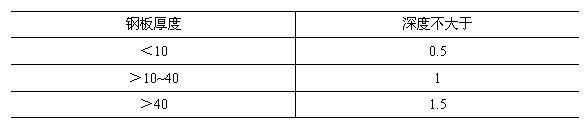 6 焊缝应均匀平整,不应有裂纹、夹渣、烧穿、未焊透等缺陷。重要部位的焊缝还不应有气孔,且咬肉长度不得超过焊缝长度的15%,咬肉深度应符合表1的规定。